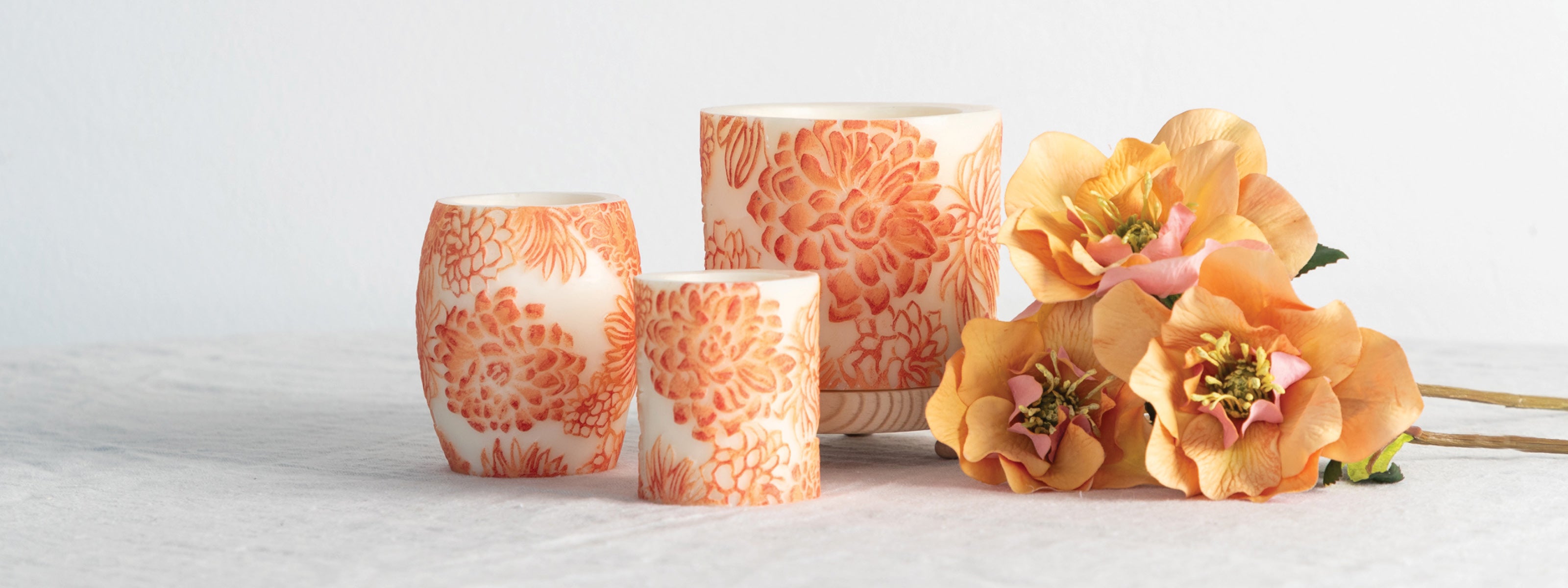 A natural cotton wick is placed down the centre before the wax is levelled and left to set. Once firm, the carving on the outer wall is refined using a sharp tool ensuring every piece is a work of art.